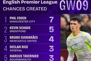 英超第9轮创造机会榜:福登7次居首,沙德5次第二,吉马良斯4次